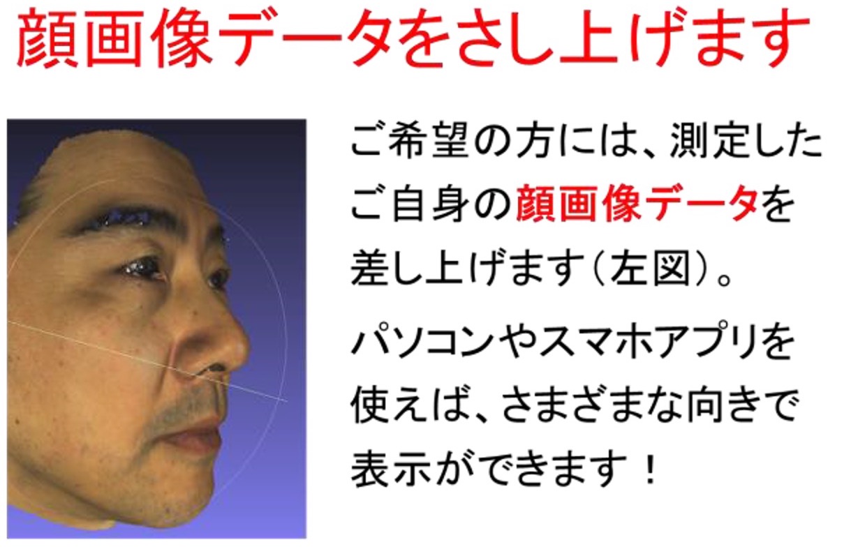 *希望者にはご自身の顔形状の3Dデータを差し上げます。スマホアプリやPCに取り込めば、さまざまな向きで表示することが可能です。